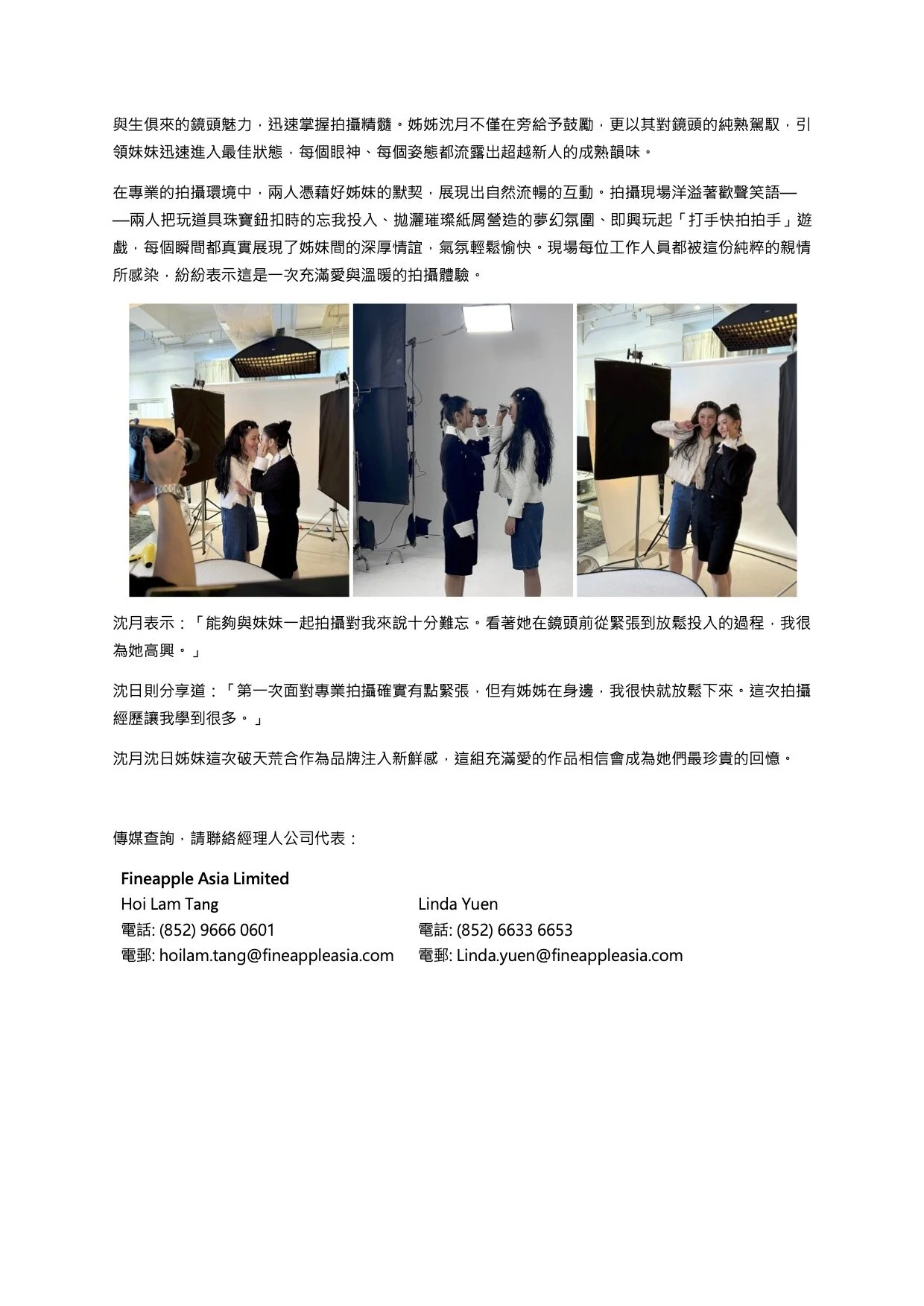 經過攝影及品牌團隊的精心改造,沈月沈日換上青春活潑的造型,令在場所有人眼前一亮。這次沈月大膽突破,一改往日少女甜美形象,展現充滿活力的全新一面。儘管初次置身於聚光燈下,沈日亦展現出與生俱來的鏡頭魅力,迅速掌握拍攝精髓。姊姊沈月不僅在旁給予鼓勵,更以其對鏡頭的純熟駕馭,引領妹妹迅速進入最佳狀態,每個眼神、每個姿態都流露出超越新人的成熟韻味。